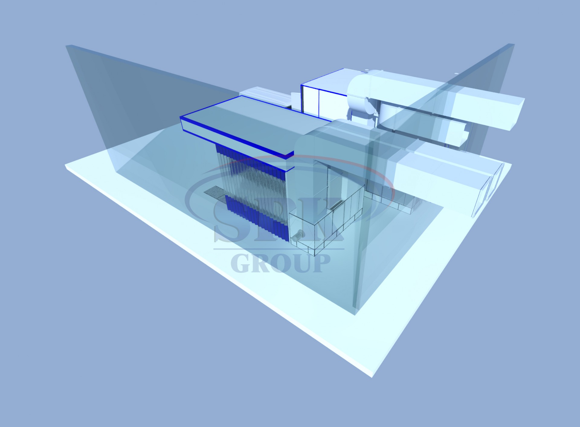 Общая освещенность - не менее 800-1100Люкс. Все светильники - взрывобезопасные. В верхней части кабины ОСК находится пленум высотой 600 мм. Пленум образован стеновыми, крышными и потолочными сэндвич панелями, толщина которых - 50 мм.