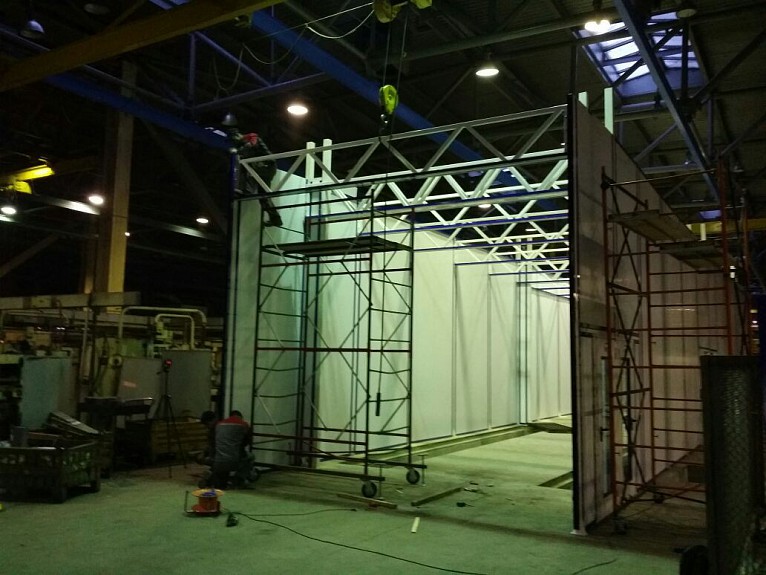 Кабина камеры. Камера тупикового типа модель SPK-15.5.5 собирается из металлокаркаса и сэндвич-панелей. Приточно-вытяжная вентиляционная система имеет внутреннее исполнение, нижним отвод воздуха - нижний. Воздухообмен внутри камеры покраски рассчитан на одновременную работу до двух покрасочных постов .
